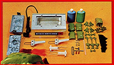 | Motorized Monster Maker Starter Set No. 6701 Includes: - 1 heating unit - 2 safety handles - 1 O. G. Ogre mold - 2-4 oz. bottles of SUPERPLASTIC TM - 1 mixing stick - 1 motorized body with key - 2 unmotorized bodies - 3 sets of decorative accessories - 1 loin cloth - cement |