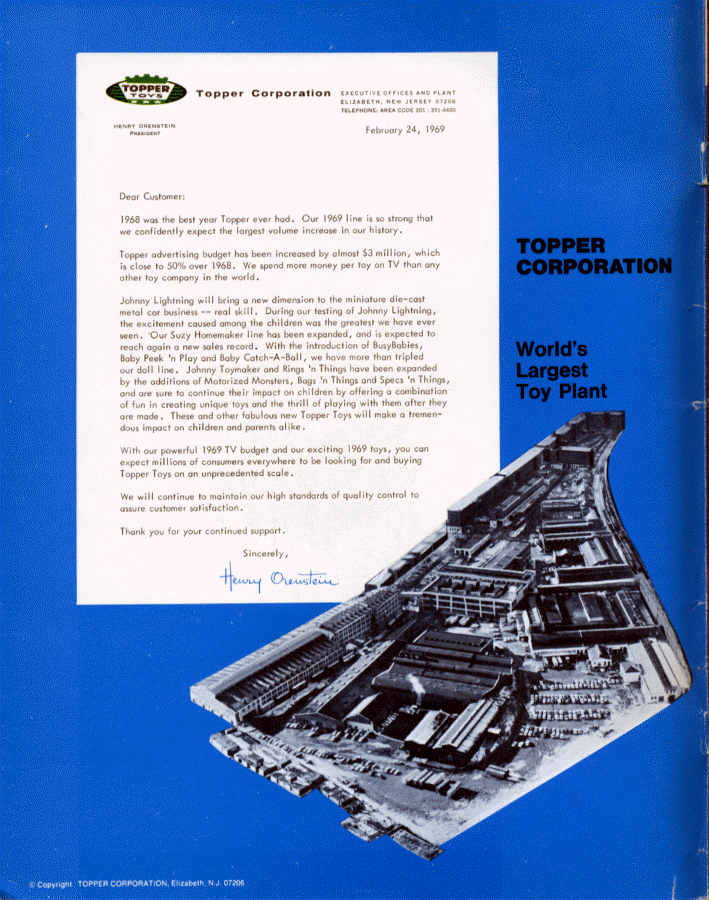 Inside cover of Topper Toys Dealer Catalog, 1969